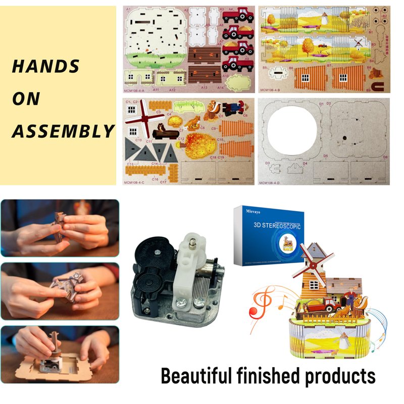 - [3D wooden music box] composed of wooden pieces, after the assembly is completed, turn the bottom mechanical spring, the windmill begins to rotate with the music.