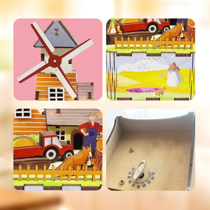 Pastoral windmill music box It is composed of different colored wooden puzzle pieces in 3d shape, containing a mechanical movement, clever use of gear transmission, rotating the bottom spring, playing music, and the windmill begins to rotate with the music.