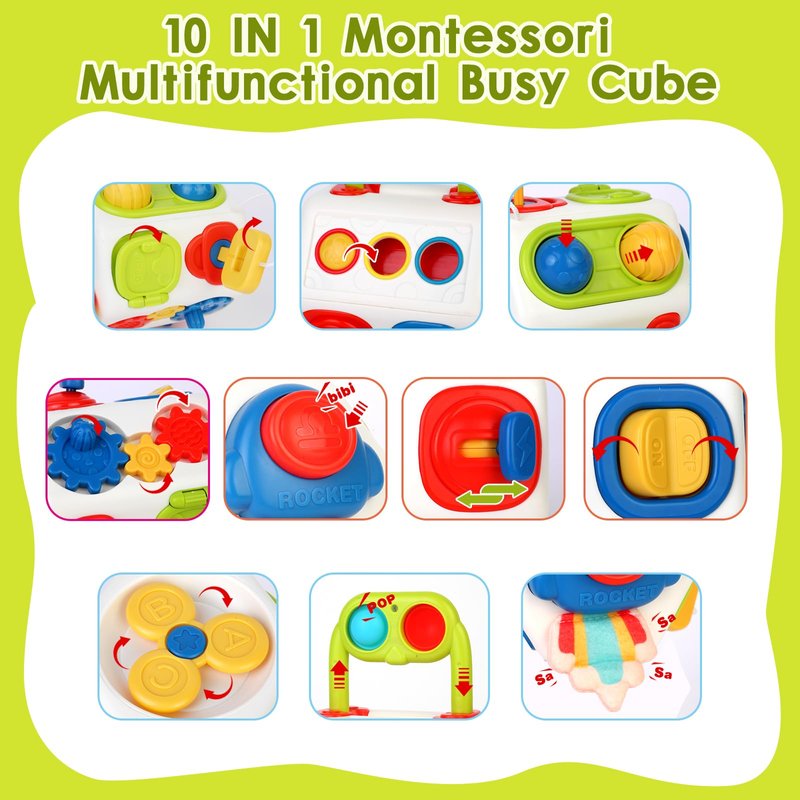 - 1. 10 in 1 Multifunctional Busy Cube: Designed to mimic the appearance of a space ship, providing children with a variety of sensory experiences. The 10 different game functions are: rotary toy, rocket toy, portable handle, mole, push sensory toy, analog power switch, analog button switch, analog key switch and mirror, gear rotation, and pull tail! Offering endless fun and learning opportunities, this toddler sensory toy is colorful and cute, designed for babies 18+ months and boys and girls 2-3 years old.