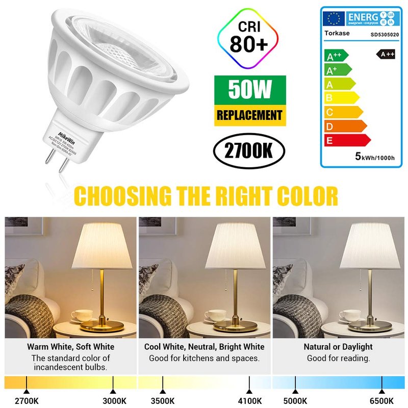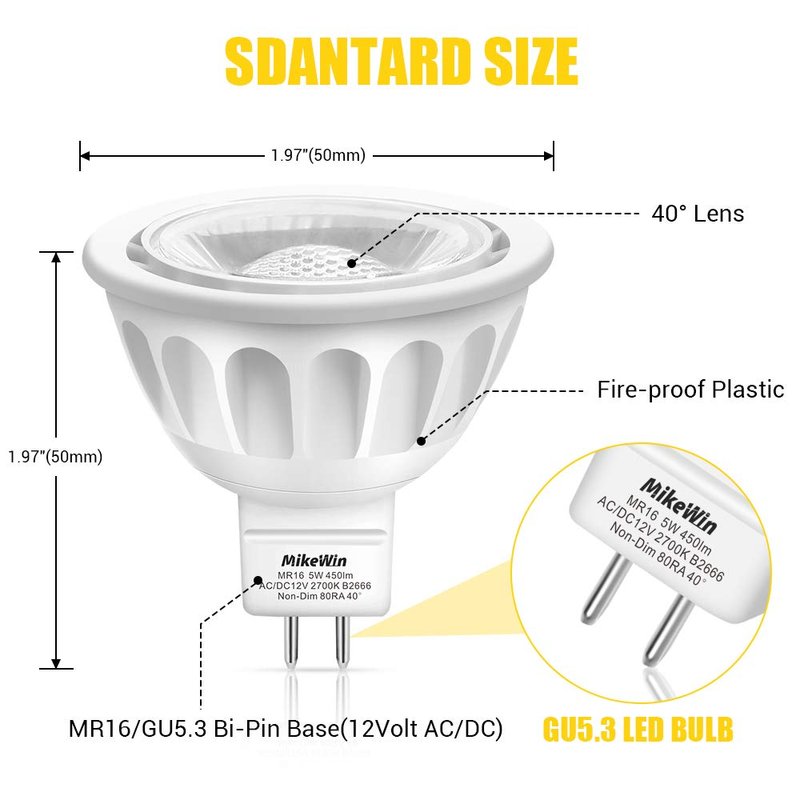 MR16 shape led light bulb with bi-pin (GU5.3) baseMikeWin modern MR16 LED Spotlight(50W equivalent) has a GU5.3 bi-pin base. Our high quality, energy efficient light is as bright as a 50W standard incandescent light bulb. The bulbs do not generates heat and uses 90% less energy with much longer expected lifespan. Our MR16 bulbs are recommended for indoor use and can be used outside with waterproof enclosures. Common customer applications of this bulb are for home indoor track lighting, recessed ceiling/display lighting, desk/table lights, and pathway/landscape lighting (installed in proper enclosures). Choose our highly reliable 12-Volt MR16 bulb for your residential or commercial needs. Specifications:Base: GU5.3 bi-pin baseColor temperature: 2700K (Warm White)Lifespan: 50,000 hoursBeam angle: 40 degreeBrightness: 450 LumensLumens per watt: 90-100CRI: >80RASize: Φ 50 *50mmWattage: 5WInput line voltage: AC120 VoltDimmable: Non DimmableWorking temperature: -20℃~+40℃Lead and mercury freeAttention: ☞ AC/DC 12V: To avoid burning, please not use higher 12V voltage link with this bulb, if your working voltage is AC100-240V, must add a transformer for 12V, because the bulb is low voltage!!!☞ GU5.3 Bi-Pin Base: Please don't mix with MR11 bulb(GU4.0, diameter 35mm, pins distance 4mm), this is MR16(GU5.3, diameter 50mm, 5.3mm between pins)☞ Not Waterproof: it should be installed indoor or in a waterproof fixture, avoiding burning out by water getting in. Don’t use it in totally enclosed luminaires, good heat dissipation can ensure long lifespan☞ MR16 LED transformer Needed: To avoid flicker, please try to use LED transformers. If flickering occurs using a halogen transformer, please add 1-3 MR16 halogen light bulbs to help stabilize the circuit, because the LEDs consume too little wattage for the system to work properly ☞ Never put this product in fire or water
