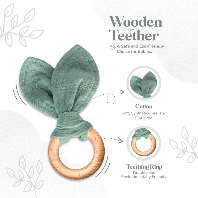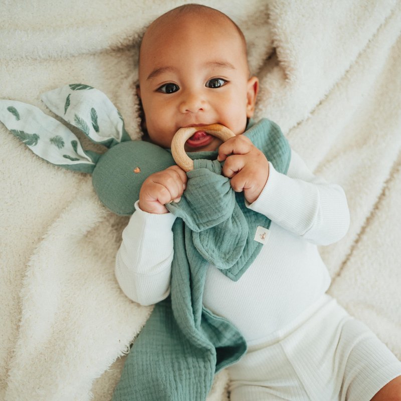 - [FOR LITTLE EXPLORERS]- The long bunny ears of the breathable lovey and its carefully sewn cloth ends are perfect for grabbing and playing. The teething ring made of untreated wood with matching rabbit ears is ideal for biting and suckling.