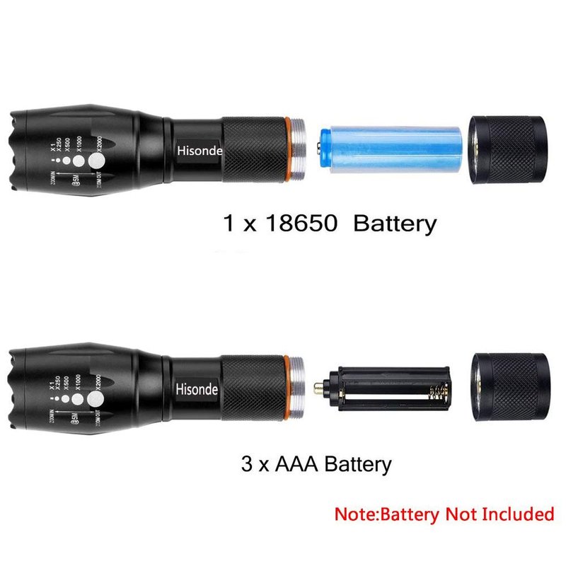 5 Mode: High, Middle, Low, Strobe & SOS / Zoom in & out Switch type: Click Reverse Switch Body Color: Black Brand: Hisonde Color: Black Power: 12W Max Output: 1200 lumens ) Light Color: White) Special Features: Zoomable) Input Voltage: 3.6-4.2V) Powered By: 3 AAA batteries (not included)) Lighting Distance: > 500 meters (over 1/3 of a mile)) , high power LED. With a lifespan of up to 100,000 hours or more. Case material:Durable aircraft-grade aluminum Waterproof, but don't put it into water long time Super Bright, blinding effect Package includes: 3 x Zoomable LED Flashlight 1x Operation Guide