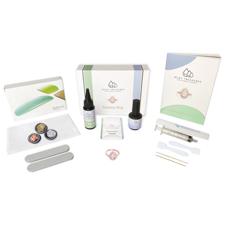 Get your own elegant and unique keepsake of your maternity, made from your own hands. This DIY breast milk jewelry kit is easy and fun to make at home. Ready to gift 🎁 For yourself or a loved one, this kit is the perfect gift for birthdays, anniversaries, baby showers, Mother's Day, Valentine's Day, Christmas, or just to say "I love you." 925 Sterling Silver 🪙 All parts crafted in 925 Sterling Silver and Rose Gold plated. Rest assured knowing that all parts are stamped with "925" as a symbol of authenticity and a promise of exceptional quality. Breast milk required 🍼 You only need 3ml or 0.6tsp of breast milk for this project. Your breast milk can be fresh or frozen. It can be even 5+ years old, as long as it has been well preserved. A unique keepsake 🤱 Your ring tells your own story, your breastfeeding journey, your dedication as a mother, your bond with your child. Our kits allow you to capture all those big emotions into something beautiful and tangible. A handmade jewel, created by you, different from any others out there.