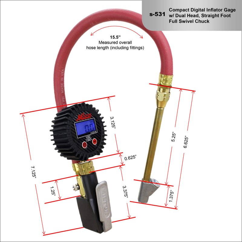 Milton S-531 Compact Digital Tire Inflator with Pressure Gauge, 255 PSI, Straight Head Air Chuck, 15" Hose, 2.5" Dial, 360 Swivel, Res: 0.1 Display, Backlit, Made in USA, Industrial Grade, Black