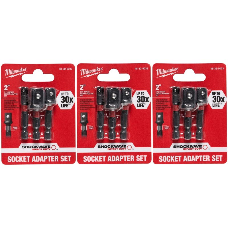 Milwaukee SHOCKWAVE Impact Duty Socket Adapters are engineered for extreme durability and up to 10x life. SHOCKWAVE Impact Duty Socket Adapters are made from proprietary steel and heat treated to control hardness. 3 Pack