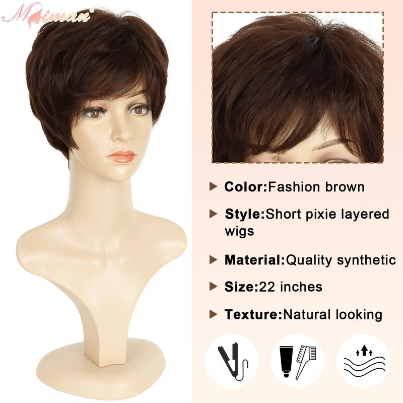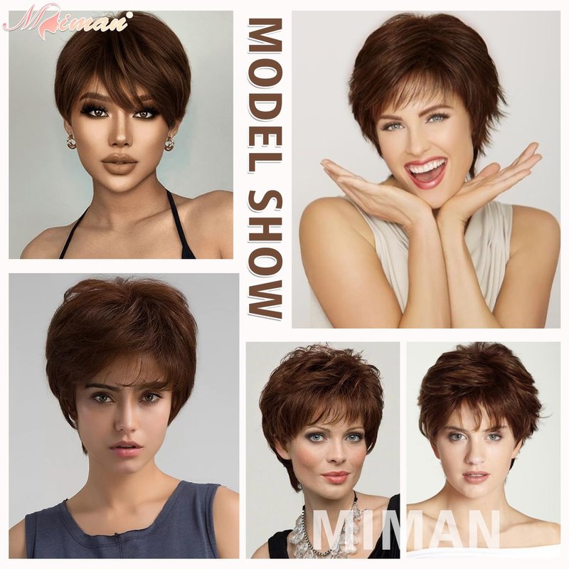 MIMAN Women's Short Brown Pixie Cut Wig Short Layered Hair Wigs with Bangs Fluffy Synthetic Hair Replacement Wig for Women Halloween Costumes Wigs