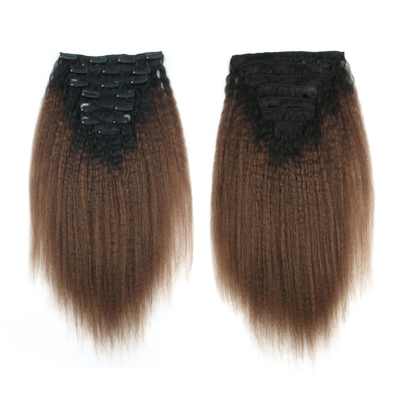 MIMIESEAT Ombre Kinky Straight Clip for Black Women Human Hair Kinky Straight Hair Clip in Extensions Natural Color to Dark Brown 120 Grams 7 Pcs with 17 Clips 16 Inch