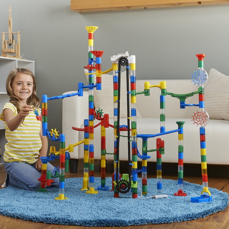 - Toys that Teach: The classic MindWare Marble Run is back but BIGGER and BETTER than ever! With over 200 track pieces and a motorized elevator, the MEGA Marble Run will send marbles on a twisting, spinning and jumping journey like you've never seen before. Exercise your hand-eye coordination and spatial skills while putting your imagination to the test. This is a great way to introduce children to trial and error.