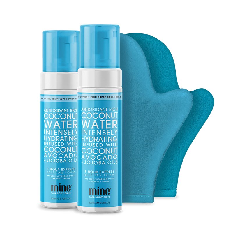 - Includes: 2 x Coconut Water Self Tan Foams, 1 x Blue Exfoliator Mitt, 1 x Blue Bronze On Applicator Mitt