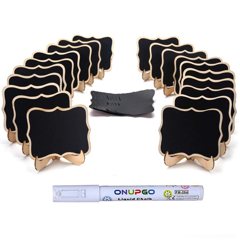 - 💖 DECORATIVE 20 PIECE SET: Packge include 20pcs Wavy edge mini chalkboard signs with easel stand + 1 liquid chalk marker + 10pcs replacement stickers. Add a chic touch to table decorations and make each table arrangement stand out.