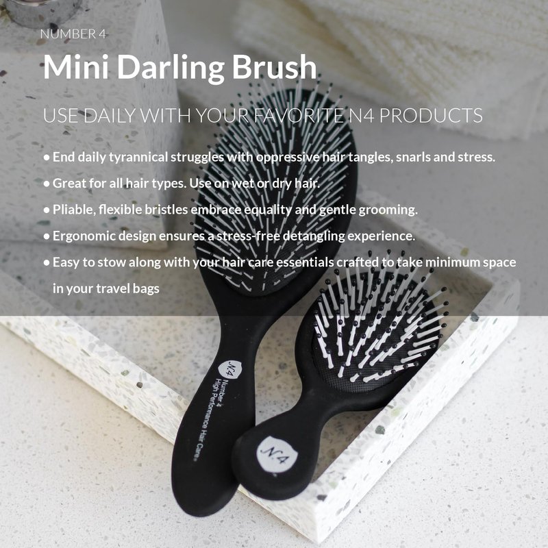 Introducing the revolutionary Number 4 Mini Darling Detangling Brush, where innovative bristle technology meets ergonomic design to transform your hair care routine into a luxurious, stress-free experience. Designed with your hair’s health and happiness in mind, this brush features unique, gentle bristles that effortlessly glide through tangles, minimizing hair breakage and making detangling a painless affair. Whether your hair is dripping wet or completely dry, our brush ensures a smooth passage, promoting 100% happier, healthier hair. Embrace the diversity of hair types with our inclusive L’eau de Mare Brush. It's more than just a tool; it's a universal hair champion that celebrates all hair textures - straight, curly, textured, thick, and wavy. This brush is the ultimate ally in your quest for smooth, effortlessly detangled hair, ensuring no strand is left behind, regardless of its type. Beyond detangling, the Number 4 Detangling Brush is dedicated to the overall health of your hair and scalp. Each stroke not only rids your hair of knots but also protects it from potential split ends and breakage. This gentle yet effective approach promotes a healthier scalp and improves hair texture, making it a must-have in your daily grooming ritual. For those devoted to their hair care routine, pair this detangling brush with your favorite Number 4 products, such as the Super Comb Prep & Protect, for enhanced results. This combination is sure to unlock the full potential of your hair, leaving it manageable, soft, and radiant. Crafted for daily use, the brush's ergonomic design ensures it fits comfortably in your hand, making detangling an effortless and enjoyable task. Whether you're gearing up for a busy day or winding down for the night, this brush is designed to make your hair care routine as pleasant as possible. Elevate your hair care experience with the Number 4 Detangling Brush – where style meets substance, and hair health is never compromised. ### Short Product Description Discover the ultimate detangling solution with the Number 4 Detangling Brush, featuring innovative bristle technology and an ergonomic design for the ultimate hair care experience. Gentle on wet or dry hair, these bristles effortlessly glide through tangles, reducing breakage and promoting healthier, happier hair. This inclusive brush works wonders on all hair types, from straight to wavy, curly, thick, and textured, ensuring every strand is smoothly detangled without discrimination. Protect your hair’s integrity with every stroke, preventing split ends and breakage for a healthier scalp and texture. Pair it with your favorite Number 4 products for optimal results and enjoy the comfort of its ergonomic design for daily use. Make detangling a stress-free, enjoyable part of your routine with the Number 4 Detangling Brush – your hair’s new best friend.