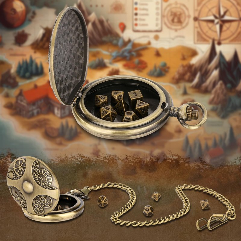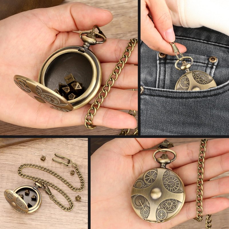 This versatile 7-piece polyhedral metal dice set contains all the dice you need. The antique pocket watch exterior, beautifully adorned with intricate gear detailing, not only protects your dice but transforms them into a distinct steampunk-inspired collectible centerpiece. Compact and travel-friendly, this unique dice case ensures your gaming accessories are always within reach.