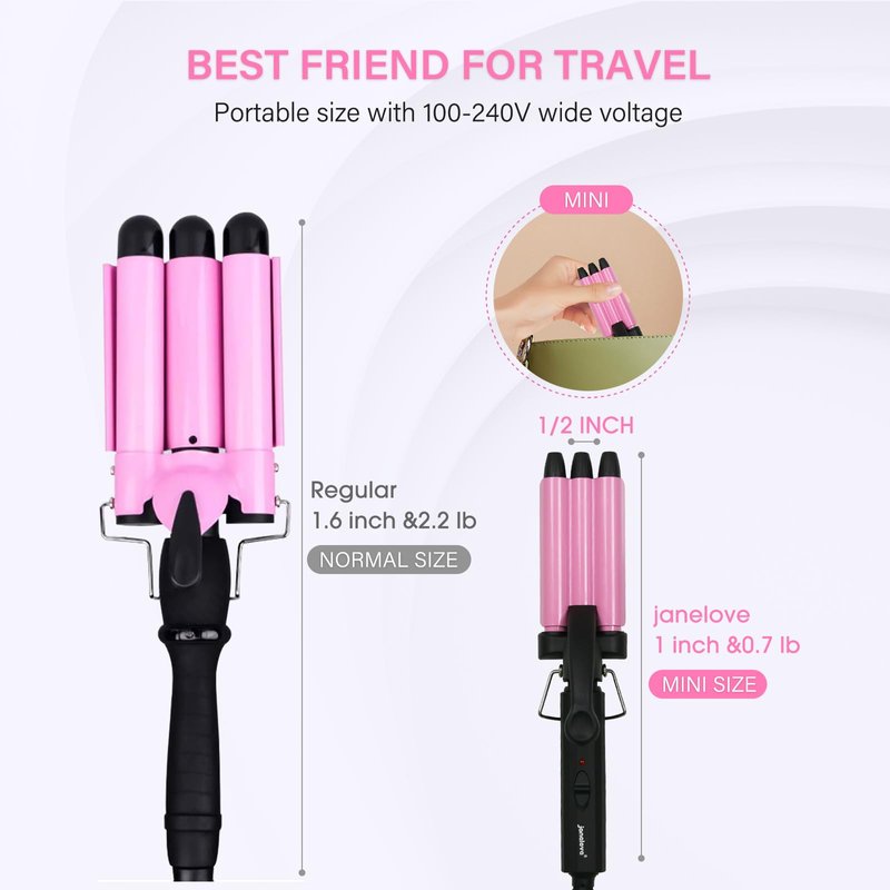 Mini Hair Crimper, janelove 1/2 Inch Beach Waves Curling Iron, Hair Waver for Short & Medium Hair with 3 Ceramic Barrels, Home and Travel Friendly Crimper Hair Tool, Dual Voltage, 392℉ Fast Heating