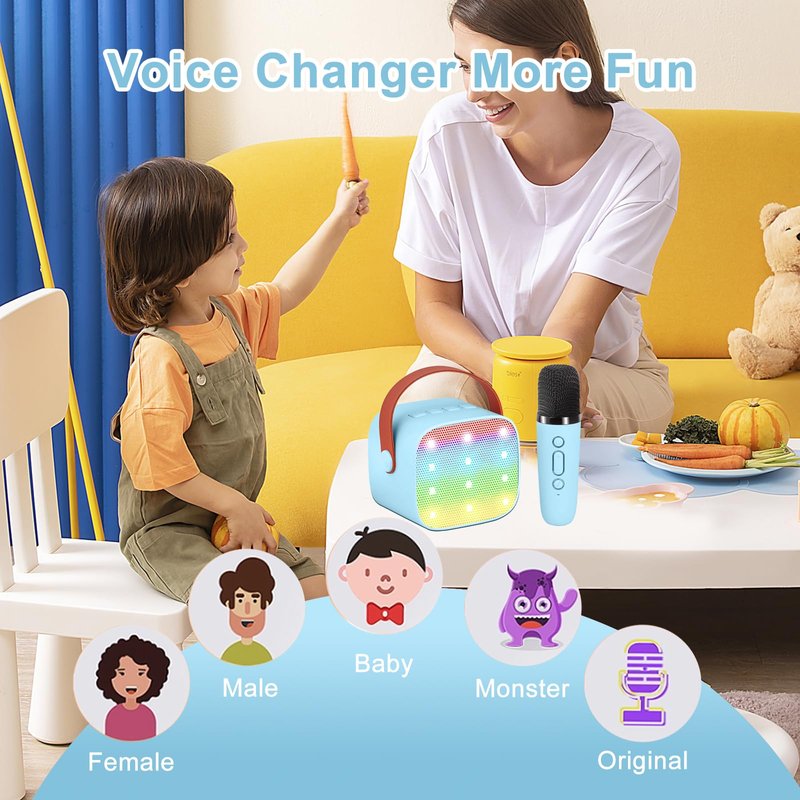 - Multi-function Karaoke Machine: Kids karaoke machine is equipped with colorful lights and 5 magic sounds including girl's, boy's, baby's, monster's and the original sound.