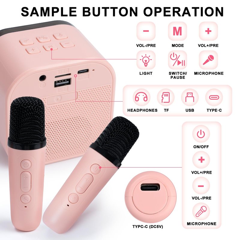 - 🎤 Mini karaoke machine brings unlimited fun: Equipped with 5 magic voices (including girls, boys, babies, monsters and original voices), fun and interesting kids toys. The LED lights will automatically change with the rhythm of the music, creating a lively atmosphere at your party! Be the star of the party at any time!
