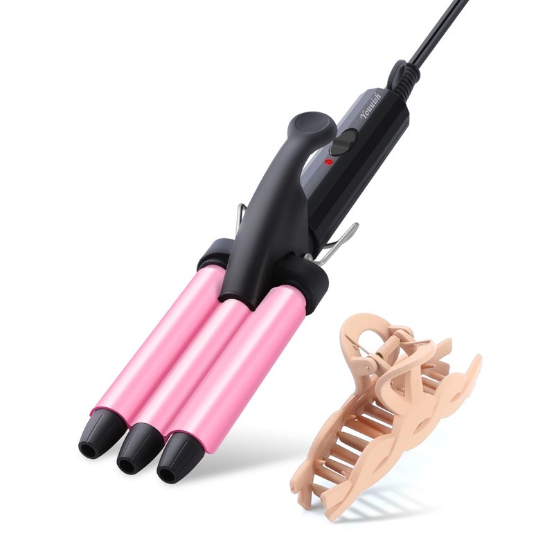 Mini Three Barrel Curling Iron, Small Curling Wand 1/2 Inch for Home and Travel, Ceramic Tourmaline Add Shine to Waves, Youuish Dual Voltage Hair Crimper, Pink