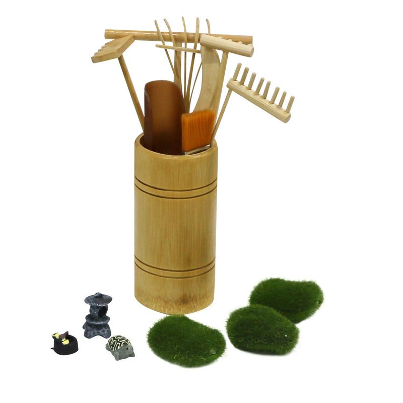 - There are total 15PCS, 3 moss, 6 mini bamboo rakes, 1 sand brush, 1 sand spoon, 1 rakes holder, 3 figurines (1 turtle, 1 tower and 1 Zen fountain).
