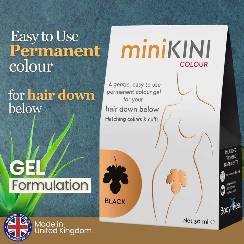miniKINI Colour is a gentle formulation with Organic ingredients that colours pubic hairs. It is specifically formulated for use on the bikini area and does not contain harsh ingredients like Ammonia or Parabens. It is quick and easy to use; once you have done a patch test, mix the colours and leave on for 30 minutes (full instructions included). miniKINI comes in 3 colours: Natural Dark Brown (this is like a brown / black), Natural Dark Blonde and Black miniKINI Colour will not only cover gray hair but this easy to use gel colour also enables women to match their hair below to their hair on top. So a natural brunette who has coloured their hair blonde can now be blonde down below. It is also suitable for men who wish to colour their beards, moustache or chest hair. So women and men of all ages can now have matching collars & cuffs. The Dark Brown colour is suitable for use on Brown/Black hair. Normal hair colour would be too harsh to use in this sensitive area. 75% certified organic ingredients. Condensed Instructions. Before starting please read the full instructions which are contained with the product , as this contains important information which must be followed when using this product . ALWAYS carry out the sensitivity patch test before using the product.
