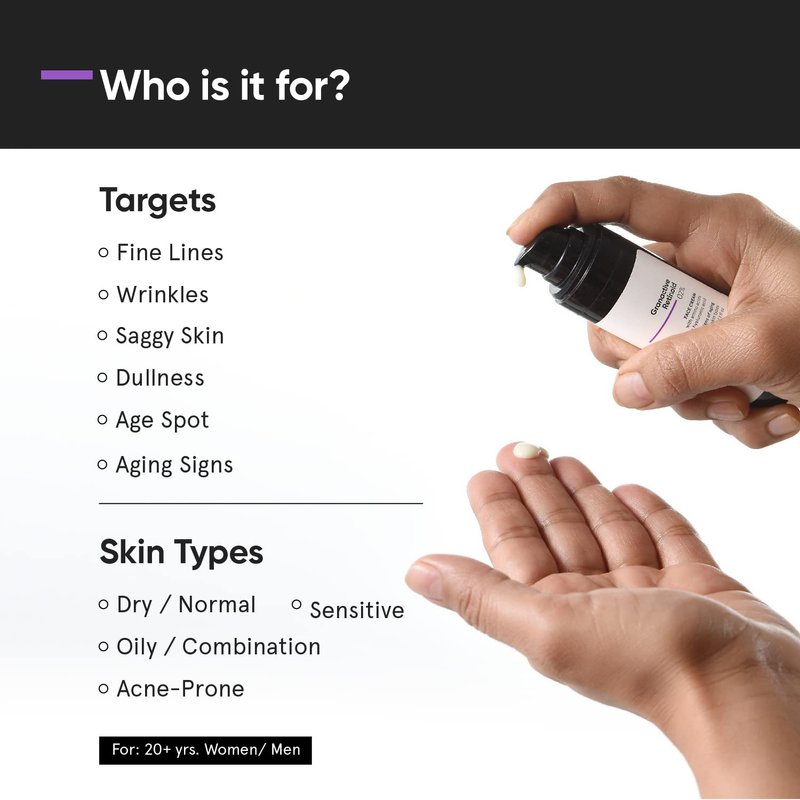 - [ FOR ALL SKIN TYPES ]: This Granactive Retinoid based cream is best suited for all skin types compared to traditional Retinols as it is less irritating. Oily, Dry, Sensitive, Combination, Normal. Apply on cleansed face after all your serums, and before moisturizer. Use of sunscreen is highly recommended when you are using this product. When to use: PM. Start with 2-3 times per week & increase gradually to everyday.