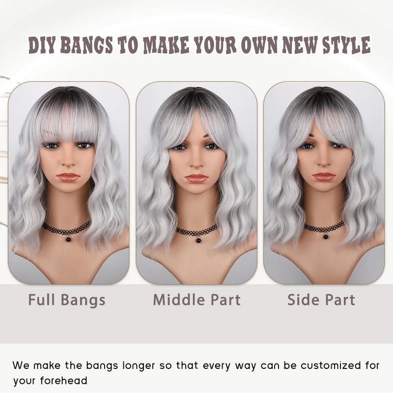 • Fashion Silver Wigs- The silver gray wig is a fresh bob with full bangs,the bangs and distinctive waves bring a modern flair to the classic bob style