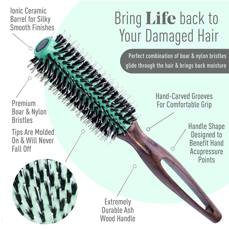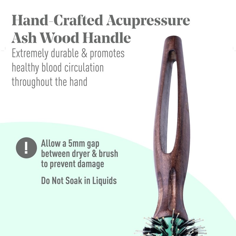 - ✅ ACUPRESSURE ASH WOOD HANDLE — This handcrafted wooden round brush is extremely durable and has been specially shaped to promote healthy blood circulation throughout the hand.