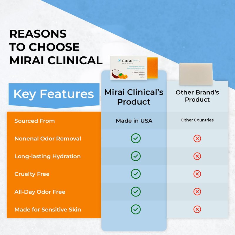 - ANTI-ODOR SOAP: Mirai Clinical’s unisex deodorizing soap bar eliminates all kinds of body odors and keeps your skin squeaky clean and freshly hydrated all day long.