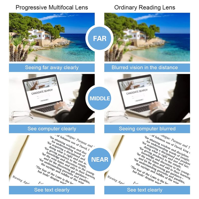 - 【 Progressive Multifocal Glasses】Progressive multifocus glasses for all your need. Top part is zero magnification for walking, shopping. The middle part is slightly reduced power magnification for working on computer, watching TV, etc. The bottom part of the lens is full-power,used for nearly distance reading. It means that you can wear the glasses anytime and anywhere. If you are using progressive lens reading glasses for the first time, It takes a few days to get used to!