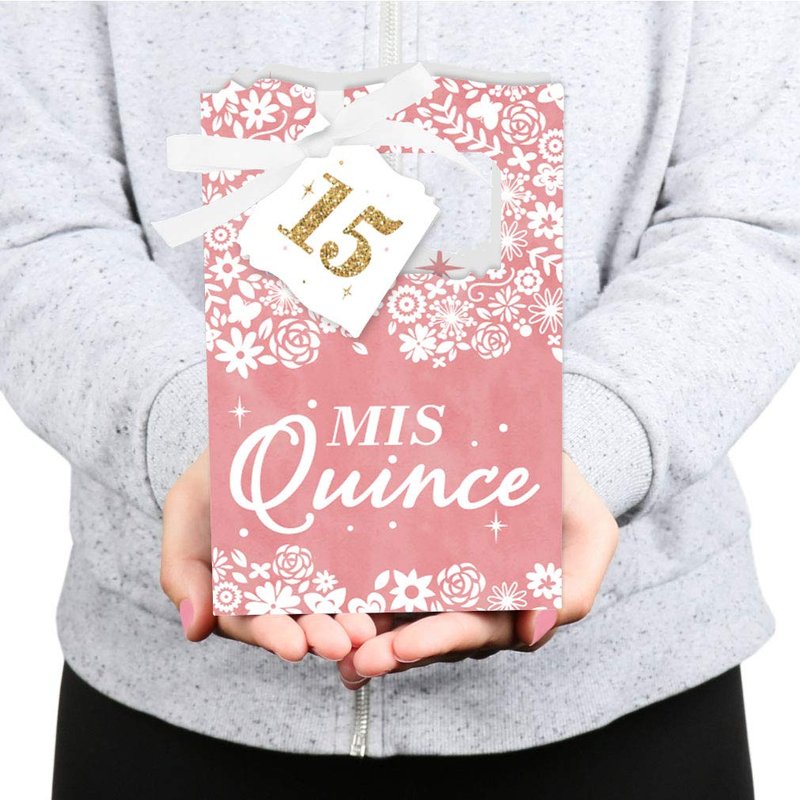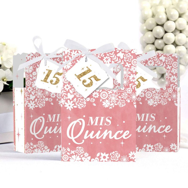 - Mis Quince Anos Favor Boxes INCLUDES 12 sweet 15 party favor bags, 12 gift tags and coordinating satin ribbon. Classic favor boxes are a party must-have. Mesa Quinceanera theme party supplies are great for a birthday party.