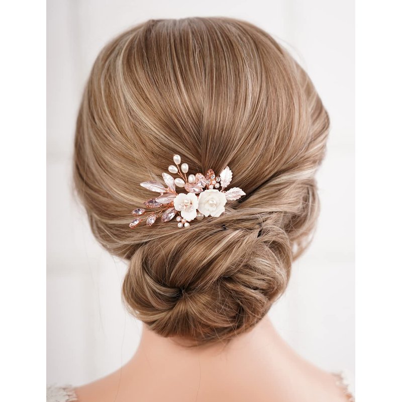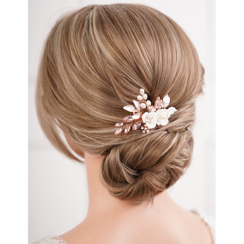 Missgrace Bridal Hair Accessories: Crystal Pearl Leaf Rhinestone Hair Comb, Gold Flower Side Clips for Brides and Women (Rose Gold Pink)