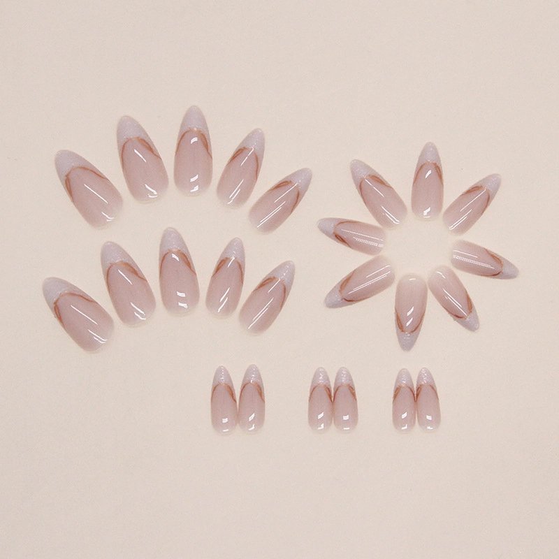 MISUD Almond Press on Nails Medium Stiletto Fake Nails Glossy Glue on Nails Chrome Acrylic Nails Bling Aurora French Tip Arrificial Nails Gold Swirl False Nails with Pearl Flash Design 24 pcs