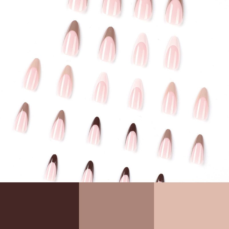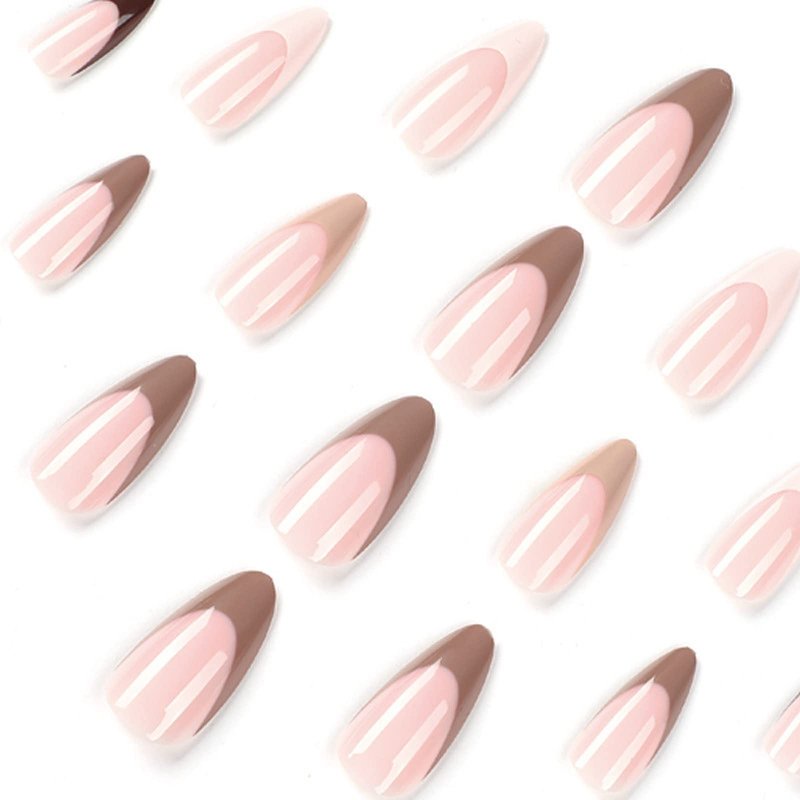 MISUD Almond Press on Nails Medium Stiletto Fake Nails Glossy Glue on Nails Fall Brown French Tip Acrylic Nails Autumn Stick on False Nails with Design 24 pcs