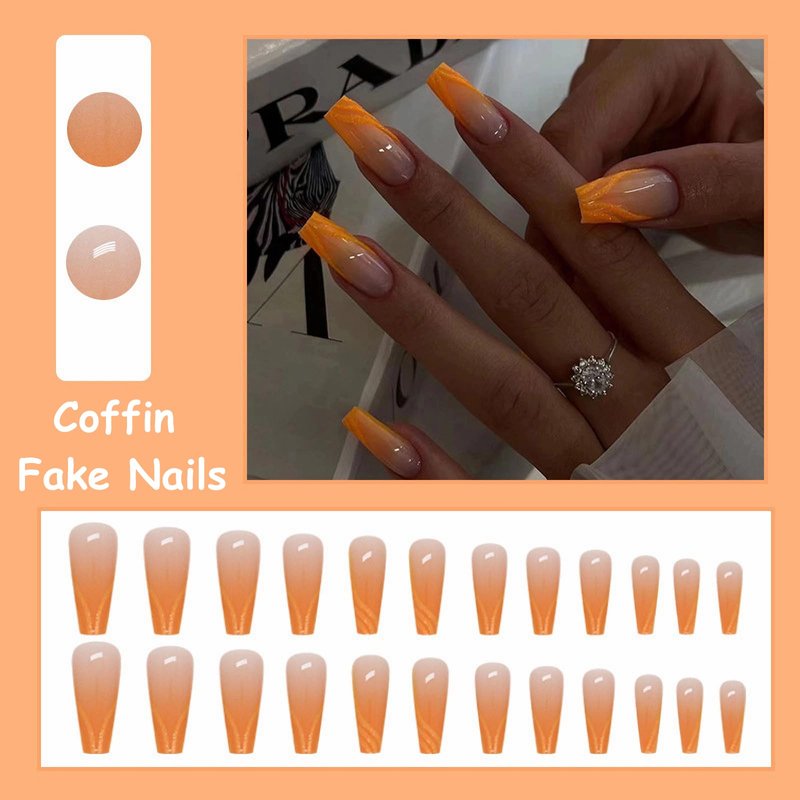 - 【Unique Design】 According to the most popular elements of the moment, these long coffin press on nails are designed with orange gradient and bling glitter swirl.