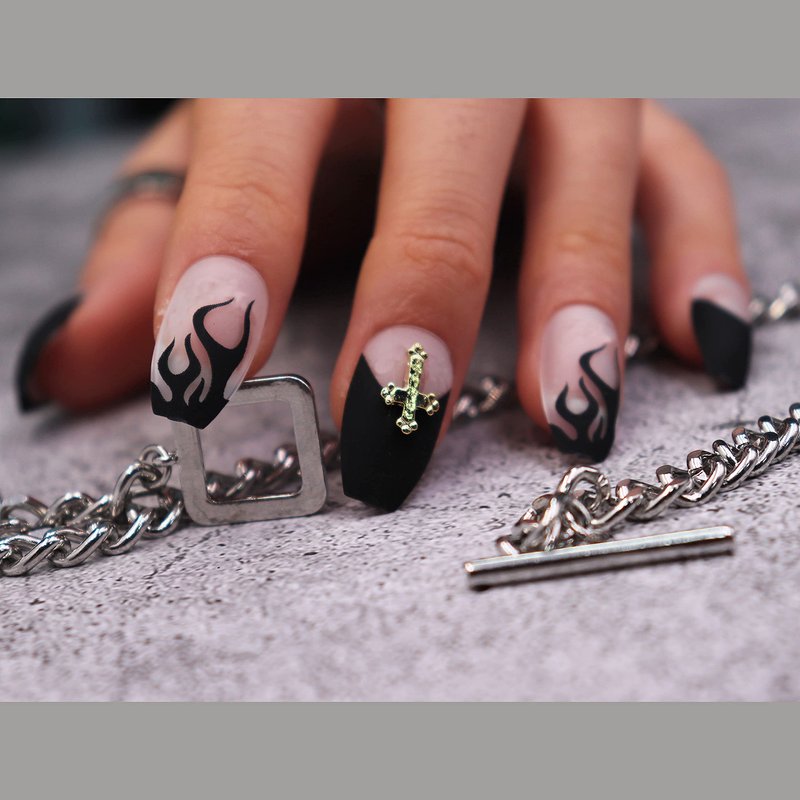 - 【Unique Design】 According to the most popular elements of the moment, these medium coffin press on nails are designed with goth black french tip, flame and punk cross rhinestone.