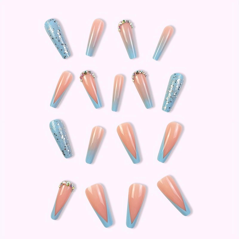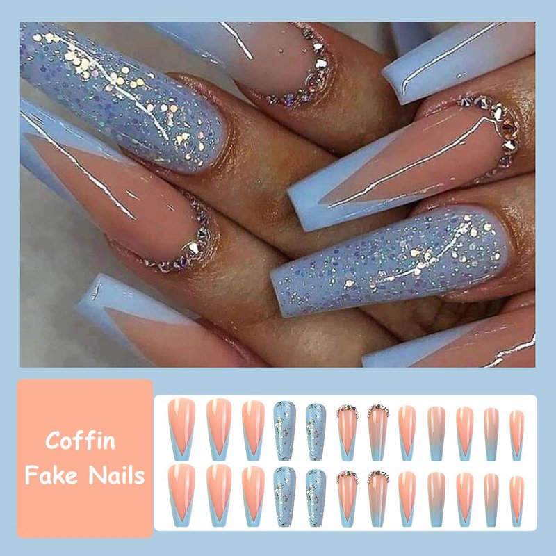 - 【Unique Design】 According to the most popular elements of the moment, these long coffin press on nails are designed with blue french tip, gradient, 3d diamond and sparkly glitter sequins.