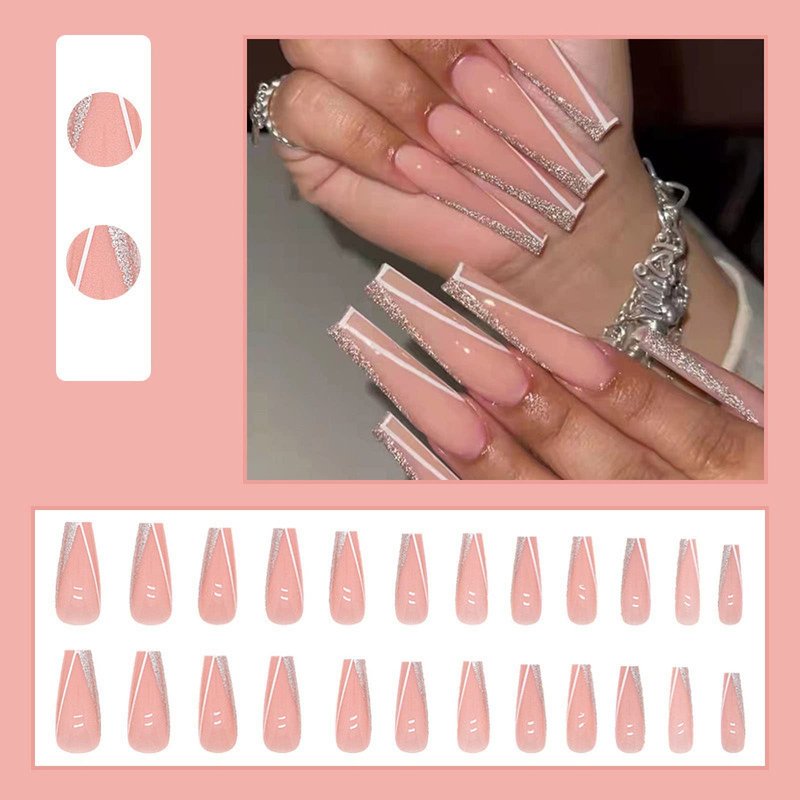 MISUD Long Press on Nails Coffin Fake Nails French Tip False Nails Glitter Glue on Nails Ballerina Acrylic Nails Pink Artificial Nails with Design for Women and Girls 24Pcs