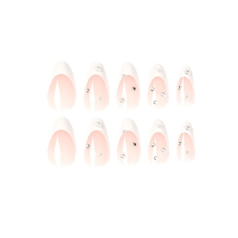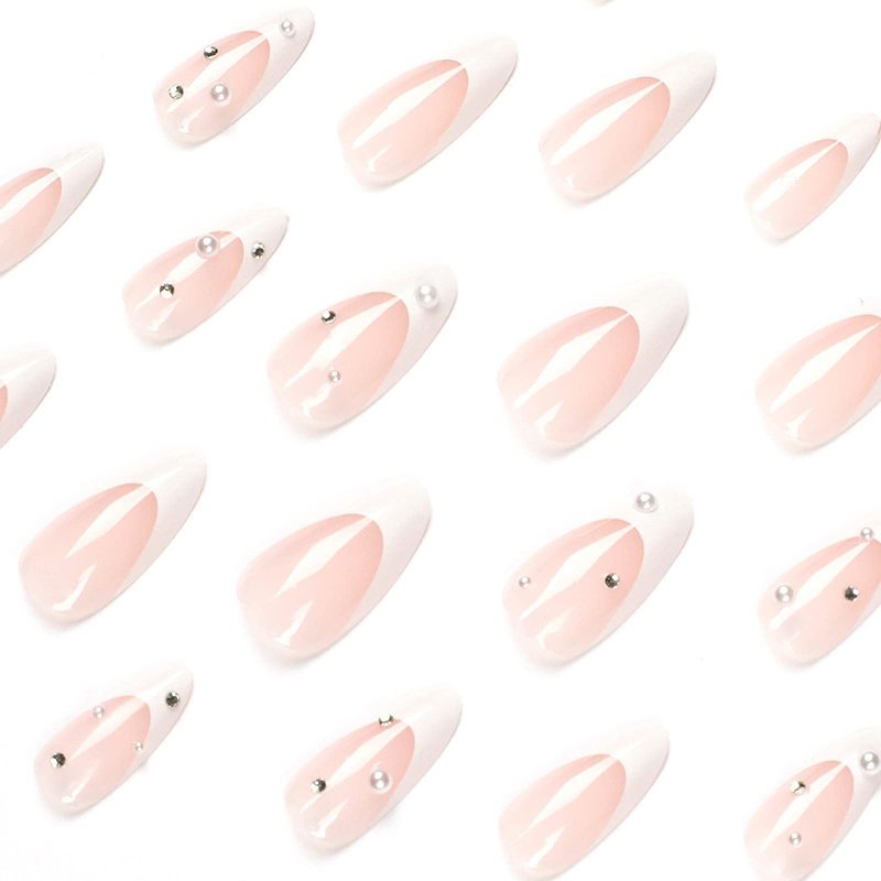 MISUD Medium Press on White Pearl Fake Stiletto Glossy False French Tip Glue on Almond Rhinestone Acrylic Nails for Women and Girls 24Pcs