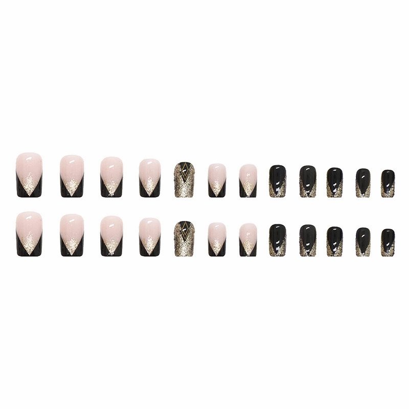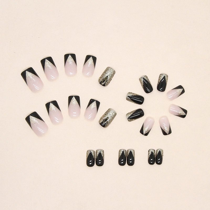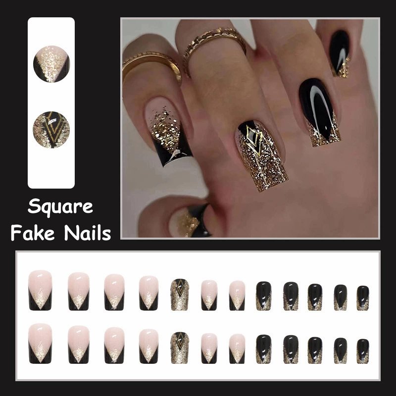 - 【Unique Design】 According to the most popular elements of the moment, these medium square press on nails are designed with black french tip and sparkly gold glitter sequins.