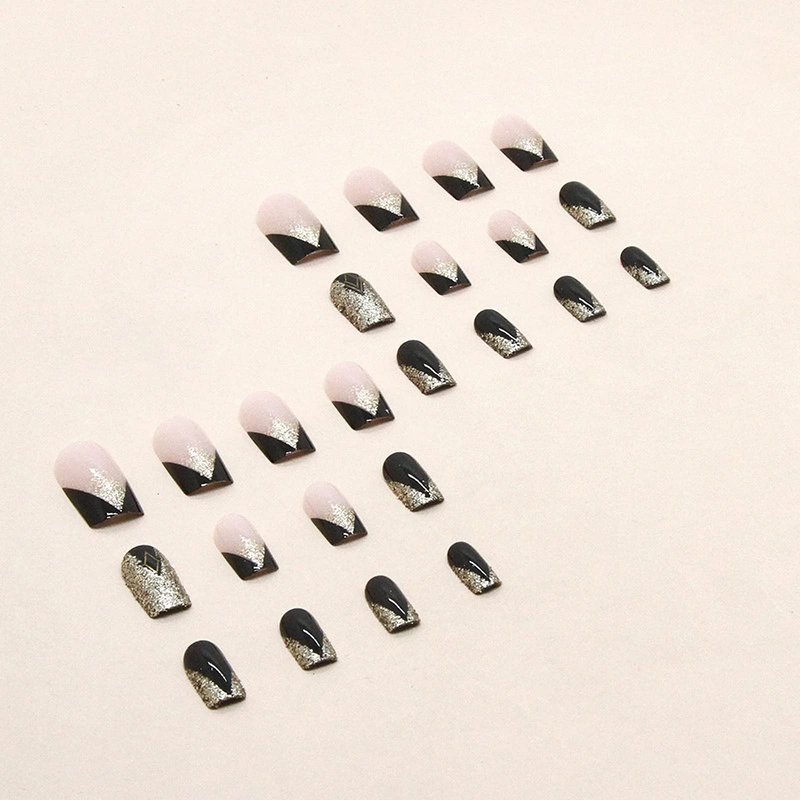 MISUD Medium Square Press on Nails Squoval Fake Nails Black French Tip Artificial Acrylic Nails Glossy Glue on Nails Gold Bling Glitter Stick on False Nails with Design 24 pcs