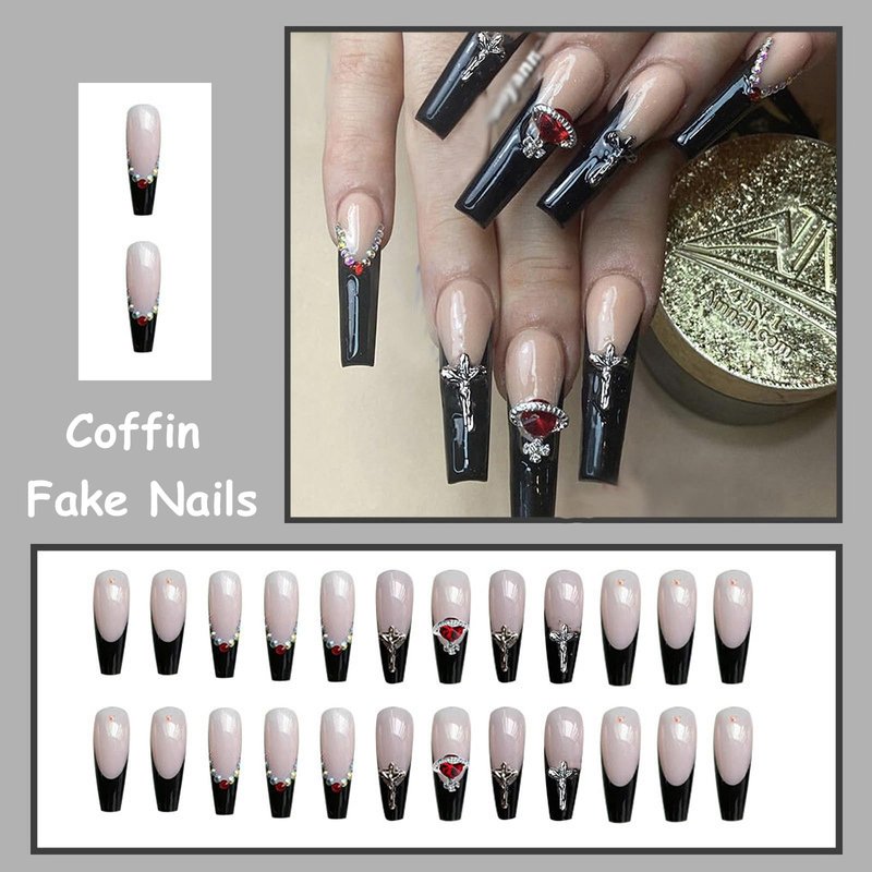 - 【Unique Design】 According to the most popular elements of the moment, these long coffin press on nails are designed with black french and punk rhinestone.
