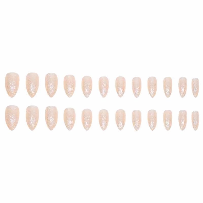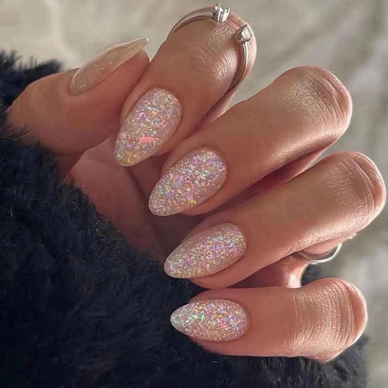 MISUD Press on Nails Medium Almond Fake Nails Glossy Glue on Nails Bling Glitter Acrylic Nails Stiletto Nude Artificial Nails Sparkly Sequins Stick on False Nails with Design 24 pcs