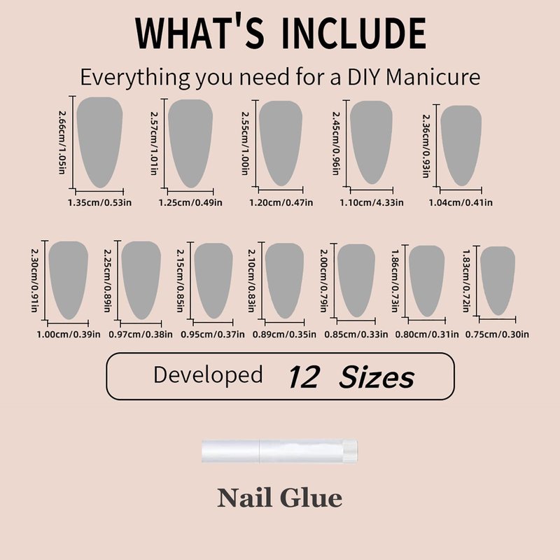 - 【Package Contents】 You will get 24 pcs medium almond press on nails (with 12 different sizes) and 1 nail glue. You can choose the most suitable fake nails for yourself according to the size and width of your nails.