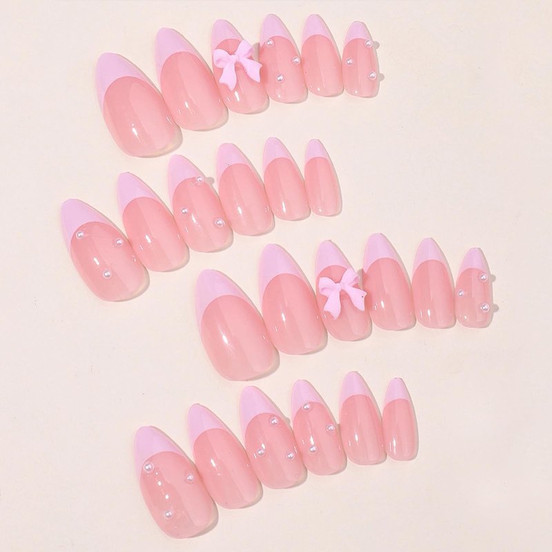 - 【Unique Design】 According to the most popular elements of the moment, these medium almond press on nails are designed with pink french tip, cute bow and pearl.