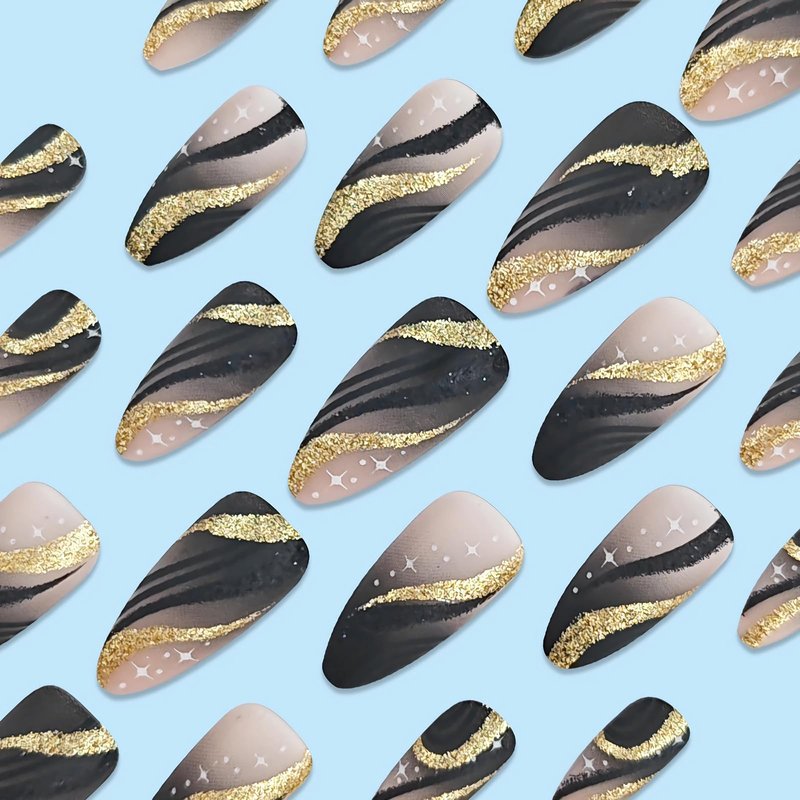 - 【Unique Design】 According to the most popular elements of the moment, these medium almond press on nails are designed with matte black ombre and bling gold glitter swirl.