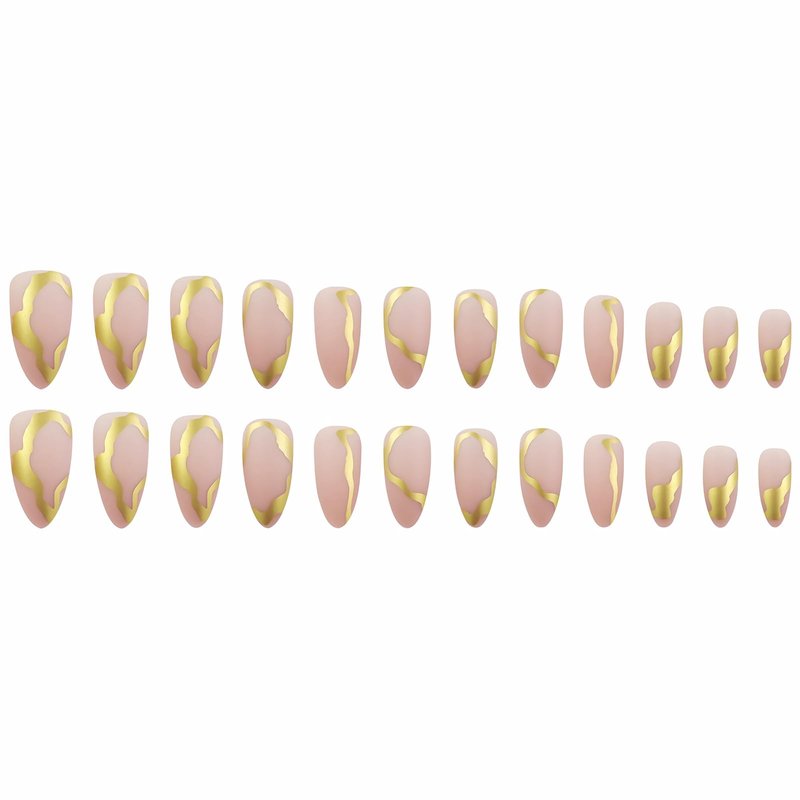 MISUD Press on Nails Medium Almond Fake Nails Matte Glue on Nails Nude Pink Acrylic Nails Stiletto Artificial Nails Gold Chrome Swirl Stick on False Nails with Design 24 pcs