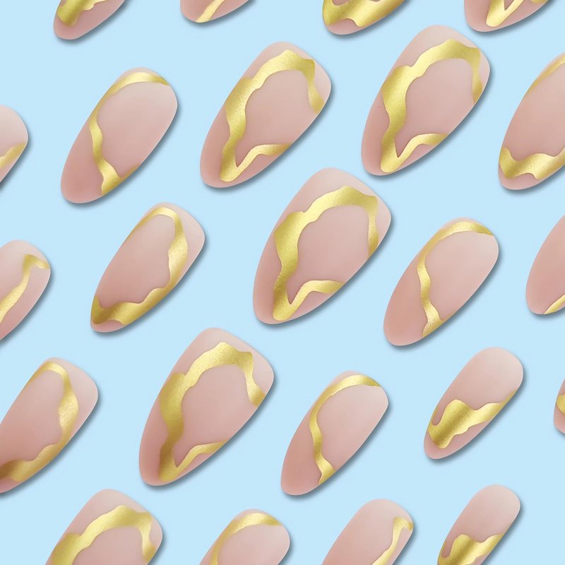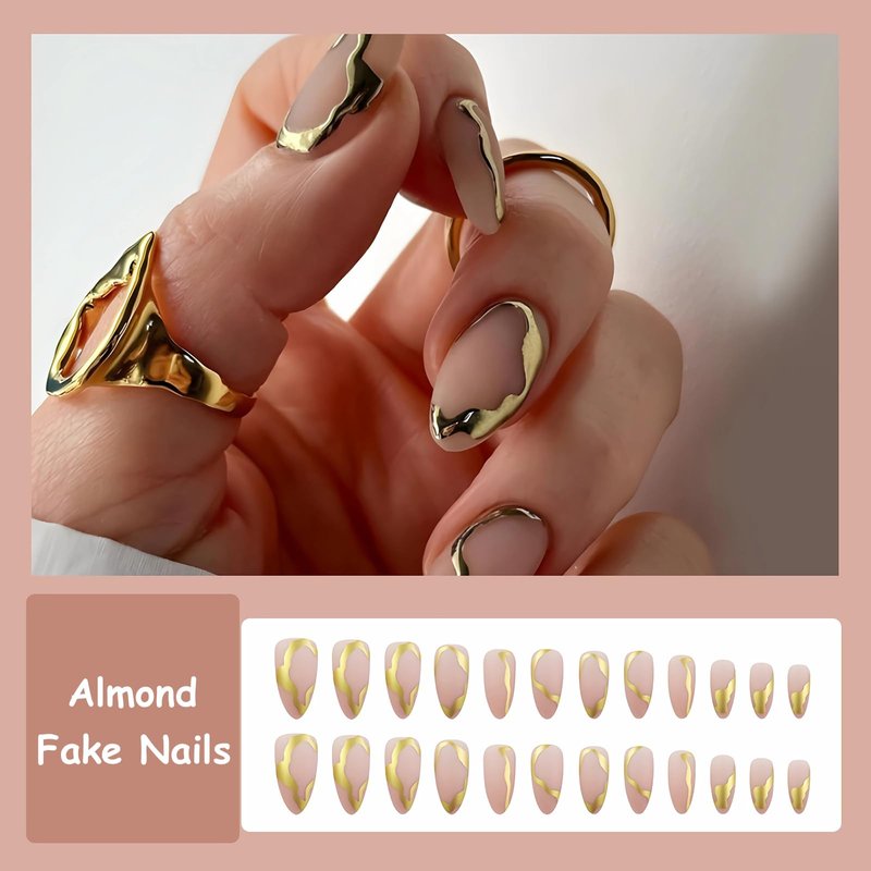 - 【Unique Design】 According to the most popular elements of the moment, these medium almond press on nails are designed with matte nude gel and gold chrome swirl.