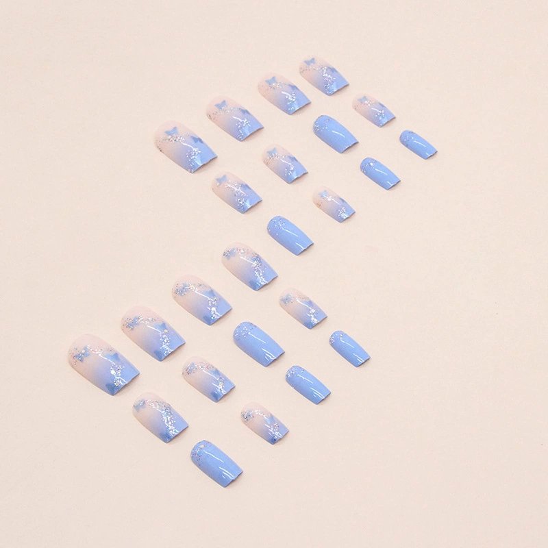 - 【Unique Design】 According to the most popular elements of the moment, these short square press on nails are designed with blue gradient, butterfly and sparkly glitter sequins.