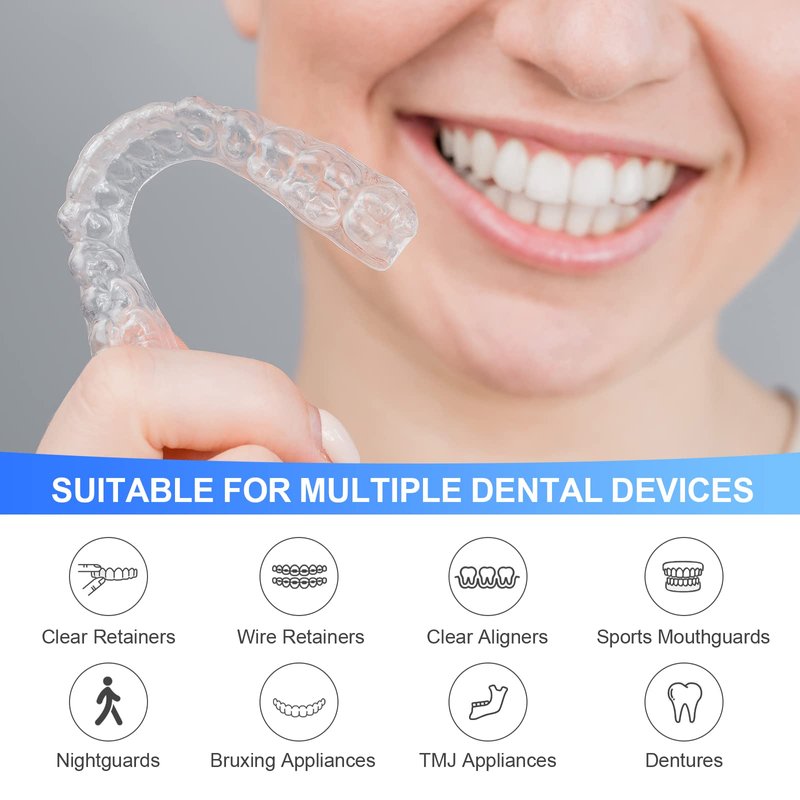 - 🔷 Suitable for Multiple Dental Devices - Our cleaner is suitable for cleaning and restoring multiple pieces, such as dentures, wire retainers, removable bridges, night mouthguards, sports mouthguards, aligners, Invisalign, bruxing and TMJ appliances, and more.