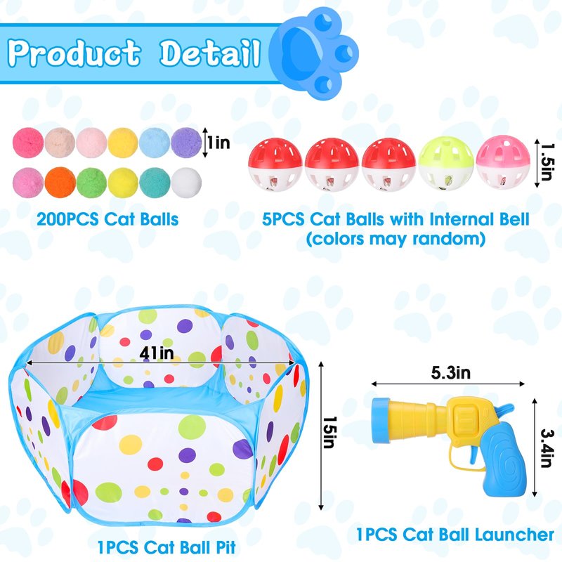 - Package: Including a cat ball pit, 200pcs pom pom balls, 5pcs cat ball with internal bell, 1 cat ball launcher (pull back the level, insert a ball into the launcher and press the button, the ball will pop up)