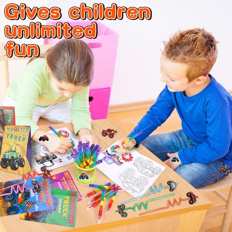 - Luxurious Monster Truck Party Favors Set: We have carefully prepared 122 pieces of monster truck birthday party favors which include 12pcs coloring books(6 styles), 12pcs stacking crayons, 12pcs food-grade plastic straws (6 styles), 12pcs slap bracelets, 12pcs key chians, 12pcs gift bags and 50pcs machine jam stickers, enough quantity to meet your party needs.
