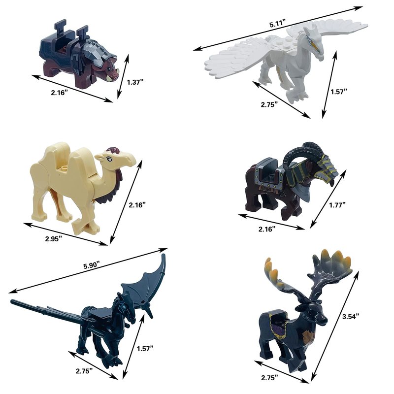 4.Movable and Compatibility:Boar Mount's armor is removable, Horned Sheep Mount's horn is removable , Megaloceros's horn is removable , Camel's head is movable , Thestral and Pegasus's wing are movable ,they can compatible for major brand.